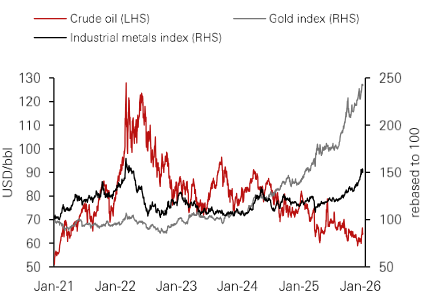 • Geopolitical tensions have increased market volatility, with recent developments around Greenland and Iran adding to the complexity. However, we anticipate that any sell-off will be less severe than that of last April. Our investment strategy aims to capture the broadening opportunities driven by AI-led innovation while navigating geopolitical uncertainties through multi-asset diversification, including increased exposure to alternatives and gold.