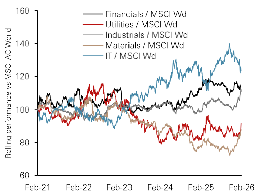 • The recent market sell-off was triggered by concerns that incumbent software companies could be replaced by AI start-ups. We believe these fears are  exaggerated, as these companies are also well positioned to benefit from AI for greater efficiency. The investor rotation from IT to other sectors broadens opportunities in industrials, materials and utilities. A multi-asset solution will help diversify across asset classes, sectors, markets and currencies.