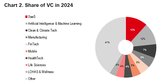 Our analysis of the VC market shows that climate and clean tech represents 5% of VC capital invested in 2024, ranking as the 6th largest category after technology, media and technology (TMT), Software as a Service (SaaS) and AI (Chart 1). When we consider VC deal volume, climate and clean tech climbs up the rankings, representing 7% and the third largest segment. This suggests that, while overall capital invested is comparatively lower, the sector is experiencing a higher number of transactions within the broader VC market (Chart 2).