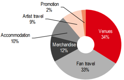 Sources: Custom Market Insights, Global Live Music Market 2025-2034; The Powerful Thinking Guide: Smart Energy for Festivals and Events, 2017; Brent Council Planning Committee Report, April 7, 2021; 'Ever wondered how we clean up Wembley Stadium after a game?’, The FA, 28 August 2019; The Cost of Music, Kyle Devine, the University of Oslo, Dr Matt Brennan, the University of Glasgow, 2019; G Kamiya, The carbon footprint of streaming video: fact-checking the headlines, IEA, 11 December 2020; J Hoker et al., Assessing the impact of festival music on bat activity, Ecological Solutions and evidence, 30 June 2023.