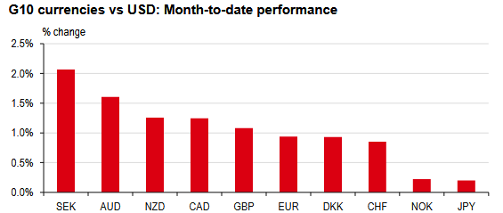 So far in December, the SEK has led G10 currency gains this month, followed by the AUD, NZD, and CAD (see the chart below). This trend reflects broad USD weakness across the G10 space (see FX Viewpoint Flash: USD: Fed’s third 25bp cut, with neutral guidance for details).
