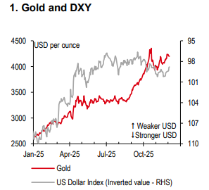 Gold prices have recently returned to around USD4,200 per ounce, underpinned by increased risk aversion and growing expectations of a 25bp rate cut by the Federal Reserve (Fed) at its 9-10 December meeting.