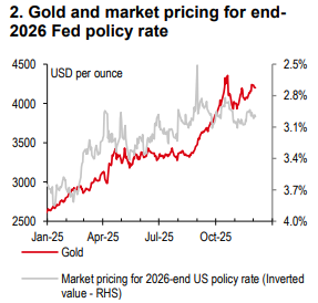 Looking ahead, the appointment of the next Fed Chair, following Jerome Powell’s term ending in May 2026, will be a key factor for markets. The new appointee is unlikely to prompt a significant hawkish policy shift, keeping the USD defensive and favouring gold in 2026 (Chart 2). In addition, persistent geopolitical, fiscal, and economic policy risks are likely to sustain upward pressure on gold, although our precious metals analyst expects heightened volatility and some price moderation in 2H26 as supply-demand dynamics evolve.
