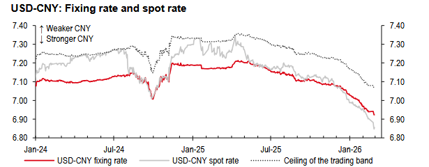 appreciation, but rather to moderate its pace. Since the Lunar New Year holiday, USD-CNY fixing rates have reached new multi-year lows, and the RMB has strengthened notably against the USD. The China Foreign Exchange Trade System (CFETS) RMB Index also rose further, indicating the RMB has been strengthening against a basket of currencies. Meanwhile, the spread between the fixing and the spot rates has widened (see the chart below). Recent cross-border flows indicate that onshore corporates and investors have been selling USD at a record pace, resulting in unprecedented net short USD-CNY forward positions. In this context, the PBoC’s decision to remove the risk reserve requirement appears justified.