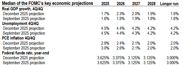As anticipated, the Federal Open Market Committee (FOMC) implemented a third consecutive 25bp rate cut at its 9-10 December meeting, lowering the federal funds target range to 3.50-3.75%. The decision passed by a 9-3 vote, with dissent from two regional Fed presidents − Austan Goolsbee (Chicago) and Jeff Schmid (Kansas City) − who preferred to maintain current rates, and Governor Stephen Miran, who advocated for a larger 50bp cut.
