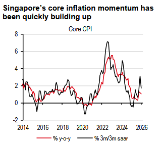 Outside of growth, inflation is another source of concern. Core inflation started 2026 with a downside surprise, coming in at only 1% y-o-y, but upside risks remain high. Recall, Monetary Authority of Singapore (MAS)-style core inflation includes energy-related components, like electricity prices, which are sensitive to volatility in global natural gas prices. We raised our core inflation forecast to 1.8% after the MAS meeting in January. Despite the downside surprise in the January core inflation, we keep our yearly forecast at 1.8% for 2026. The impact from higher oil prices is likely to be more evident from 3Q26, as there is usually a one-quarter impact lag on core inflation. We have already pencilled in the MAS policy normalisation to start in April, but we are adding one more round of tightening in October, likely bringing the SGD Nominal Effective Exchange Rate (NEER) slope to 1.5% by end-2026.