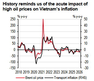 This conflict also poses major upside risks to inflation. Based on PVOIL’s data, RON95 on 19 March 2026 has increased over 50% from the end of February, pushing up inflation significantly. Thus, we have recently upgraded our headline inflation forecast to 4.3%, from 3.5%, for 2026. But if oil prices remain high, this may risk pushing inflation above the 4.5% ceiling set by the State Bank of Vietnam (SBV).
