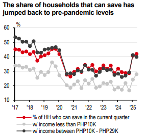 With inflation finally under control, the purchasing power of households has remained intact. As a result, private consumption, the economy’s main engine, has accelerated for two consecutive quarters already. And, despite consuming more, households, especially low and middle-income ones, were finally able to save. In fact, BSP data shows that the share of households with income of less than USD500 a month that were able to put aside money for savings was almost back to pre-pandemic levels in 2Q25. This has pushed the national saving rate high enough to close the economy’s saving-investment gap during the quarter, making the economy less reliant on foreign capital to finance its current account deficit.