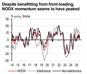 Thailand will also benefit from its new tariff advantage with China. In the US market, Thailand competes with China on HDDs, computer parts, telephone parts, and pet food. From a tariff advantage of nil to 25 ppt prior to Liberation Day, Thailand’s tariff advantage for these items now ranges from 19-35%. As a result, Thailand is likely to take some market share away from China, taking the edge off the eventual payback in frontloading demand.