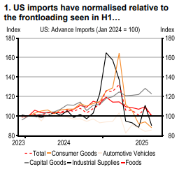 The EU is likely to be strongly affected by the pharma tariffs, even if they end up being capped at 15% as anticipated by the European Commission - imports from Ireland have already been frontloaded earlier this year. Switzerland and Singapore will also be substantially impacted. Meanwhile, Vietnam is the top import source for furniture and household fittings, and so could see some impact if trade flows dip.