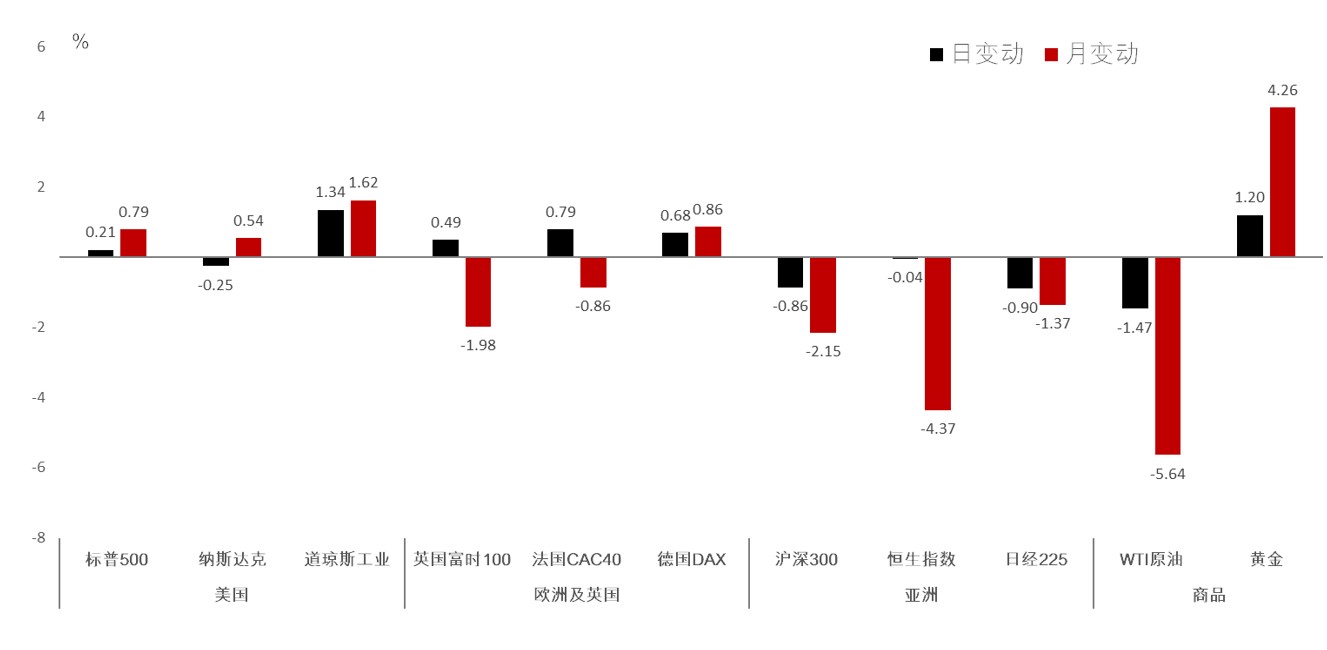 数据来源:万得,汇丰私人银行,截至前一个交易日收盘,过去数据不代表未来表现。WTI指西德州中级原油。法国CAC40指数指巴黎券商公会指数;德国DAX指数指法兰克福指数。