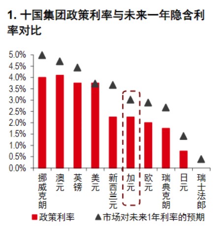 中东冲突期间,加元跑赢大多数十国集团货币。这种强势表现已开始减弱,我们预计未来几周涨势或将进一步放缓。虽然油价上涨应该为加元提供一定支撑,特别是相对于进口能源的十国集团货币而言,但我们认为相对货币政策可能产生更大的影响(图1)。