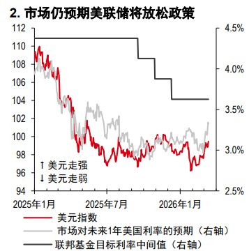 与2022 年不同,此前支撑美元结构性走强的两大核心支柱,包括(1)美联储立场明确偏向鹰派以及(2)全球经济增长持续走弱,目前均不存在。市场仍在预期美联储今年倾向于逐步降息(图2),而领先指标则指向更为稳固的全球经济增长前景。这些因素共同作用,有望为周期性货币提供支撑,并抑制美元全面走强,也支持我们的核心观点:若地缘紧张局势缓和,美元将重回走弱态势。不过,若冲突导致市场大幅重估美联储政策路径,并转向加息预期,则美元仍倾向于上行。