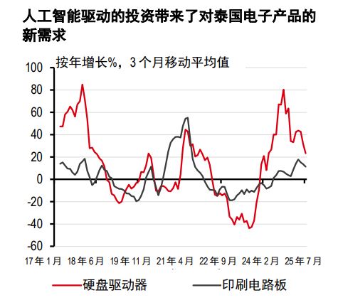 关键在于要理解,并非所有的出口激增都源于需求前置。泰国的印刷电路板和硬盘驱动器供应链根基深厚,泰国是全球第二大硬盘驱动器出口国。与人工智能相关的投资热潮为这两类产品带来了新的需求。尤其是硬盘驱动器出口,在过去12个月里平均按年增长约50%,这项曾被认为过时的技术焕发了新的活力。