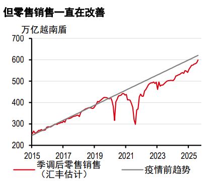 但增长动力不仅限于前置效应,第二季更是实现了广泛增长。得益于外向型贸易服务及旅游相关行业的良好增长,服务业表现强劲。这一趋势也在零售销售中得到印证,实际零售额增速与疫情前趋势水平的差距已缩小至6%。在东盟经济体中,越南的旅游业复苏速度最快。