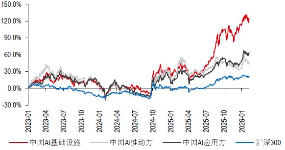 近期,美国科技股在财报季以及美联储主席候选人提名等因素影响下波动加大;与此同时,A股成长板块的波动性也相应上升,我们认为这与外围市场和AI投资相关的短期情绪变化不无关系。但是,我们对于中国科技领域股票的中长期看好观点不变,这主要基于基本面发展继续支持我们对行业的积极看法。一方面,中国科技硬件企业出海业务具备竞争力,且持续深度融入全球产业链。另一方面,算力基础设施的国产替代也在加速。从市场表现看,2026年年初以来和回顾过去几年,以国内AI基础设施公司为代表的人工智能行业依然持续跑赢大市。