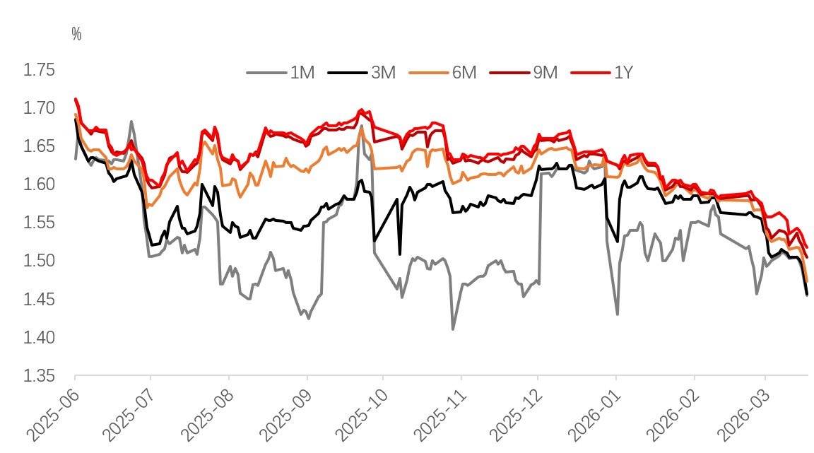与长端的波动形成鲜明对比,短端市场在3月走出了独立行情,一个关键的驱动力来自同业存款利率调降预期的升温。据财联社3月12日的报道,市场利率定价自律机制召集部分银行成员开会,要求加强自律管理,高于7天逆回购OMO(公开市场操作)政策利率(1.4%)的同业活期存款规模季度末占比不超过10%-20%。这一消息迅速引发市场反应,3月13日,1年期同业存单收益率快速下行至1.53%附近。同业存款利率下调的预期下,非银机构资金转而增配同业存单、短债等替代品种,短端资产配置需求显著提升,提振债市短端市场表现。相较于长端的不确定性,短端品种凭借低波稳健的特性,成为本月机构防御配置的核心方向,也进一步拉大了长短端利差。