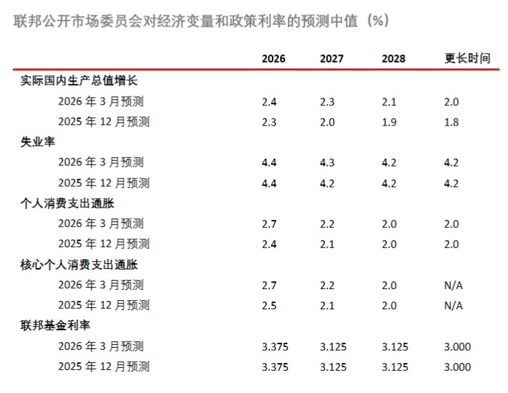 市场最为关注的利率点阵图则完全维持了去年12月的预测:中值显示2026年底利率为3.375%,对应年内仅有一次25个基点的降息;2027年底为3.125%,意味着明年还有一次降息;长期利率中值保持在3.0%。